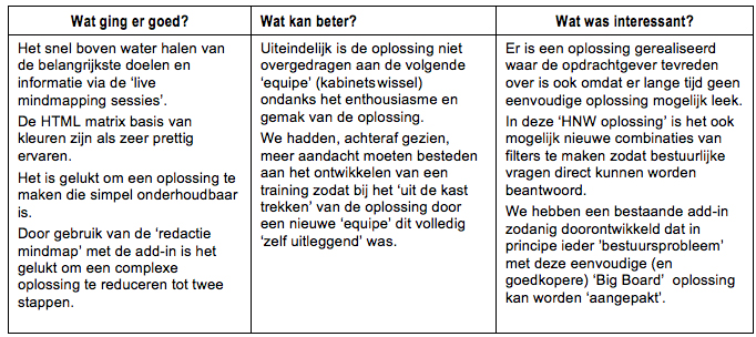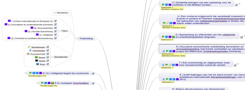 De mindmap van waaruit de matrix werd gegenereerd leende zich goed om het redactionele proces beter in te richten. De informatie in de mindmap kan bijvoorbeeld door de redacteur gefilterd worden op ‘Ministerie’ en/of ‘Sleuteldoel’ om daarna als Word document te worden geëxporteerd. Deze kan door de redacteur naar ieder ministerie verstuurd worden op de vertrouwde manier. Na het updaten van dit Word document, door het betreffende ministerie, krijgt de redacteur het Word document weer terug. Vervolgens kan de gewijzigde informatie eenvoudig worden bijgewerkt in de mindmap. Dit bespaart veel tijd in de processtappen en in het herstellen van gemaakte fouten.