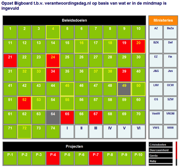 Dit was dus niet meer ‘de .ppt file’ die de doelgroep zelf eerst moest downloaden van de verantwoordingsdag.nl website, maar een simpele HTML file die zeer gelijkend was op wat de (interne) doelgroep al gewend was; het zogenaamde ‘Big Board’. Bij publicatie op een website van deze ‘matrix html file’ is het mogelijk de bezoeker direct op de website door alle informatie van het Big Board te laten klikken en zelf de invalshoek te laten kiezen door een simpel menu rechtboven in het Big Board (probeer het zelf en klik op het plaatje hierboven van Fig 3.).